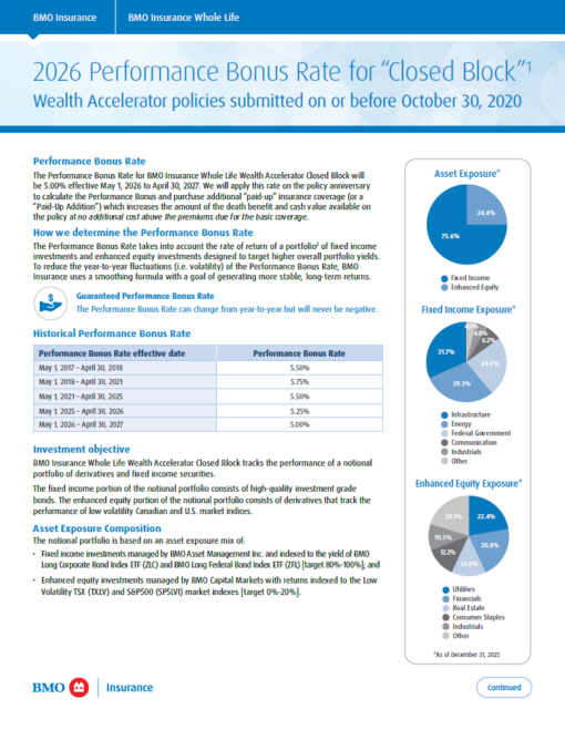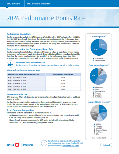 The Performance Bonus Rate takes into account the rate of return of a portfolio2 of fixed income investments and enhanced equity investments designed to target higher overall portfolio yields. To reduce the year-to-year fluctuations (i.e. volatility) of the Performance Bonus Rate, BMO Insurance uses a smoothing formula with a goal of generating more stable, long-term returns.